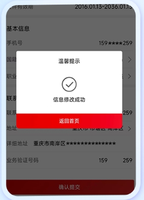 5. 点击证件有效期”进行更新,确认信息后提交,系统将提示信息修改成功”。