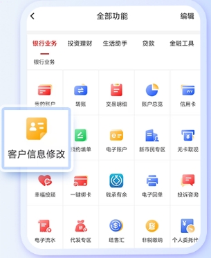 1. 登录手机银行,点击全部功能”,选择客户信息修改”。