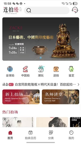 首页热门拍场”实时推送最新高热度拍卖会,助您快速锁定焦点;拍卖分类”支持按地域(全球/中国)或品类自由筛选,精准匹配兴趣;内置在线查询”功能,输入关键词即可秒速定位目标拍品或专场,提升竞拍效率。