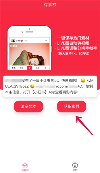 2、将复制的链接粘贴到指定的输入框中,点击获取素材”