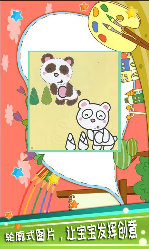 1、提供清晰轮廓线的图画模板,鼓励宝宝自主选择配色方案,释放天马行空的创造力。