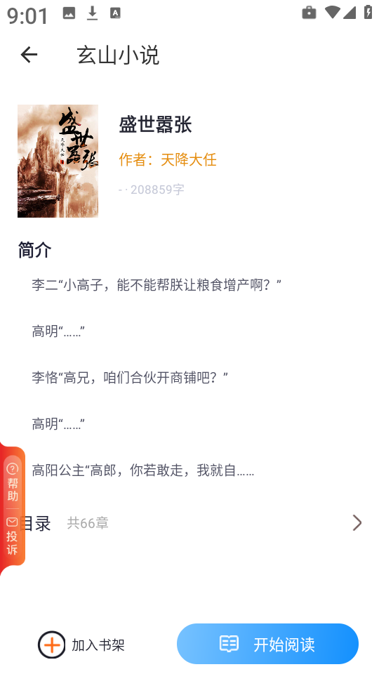 2、在首页中任选一本感兴趣的小说,比如我们选择《盛世嚣张》,点击开始阅读”按钮即可进入正文页面。