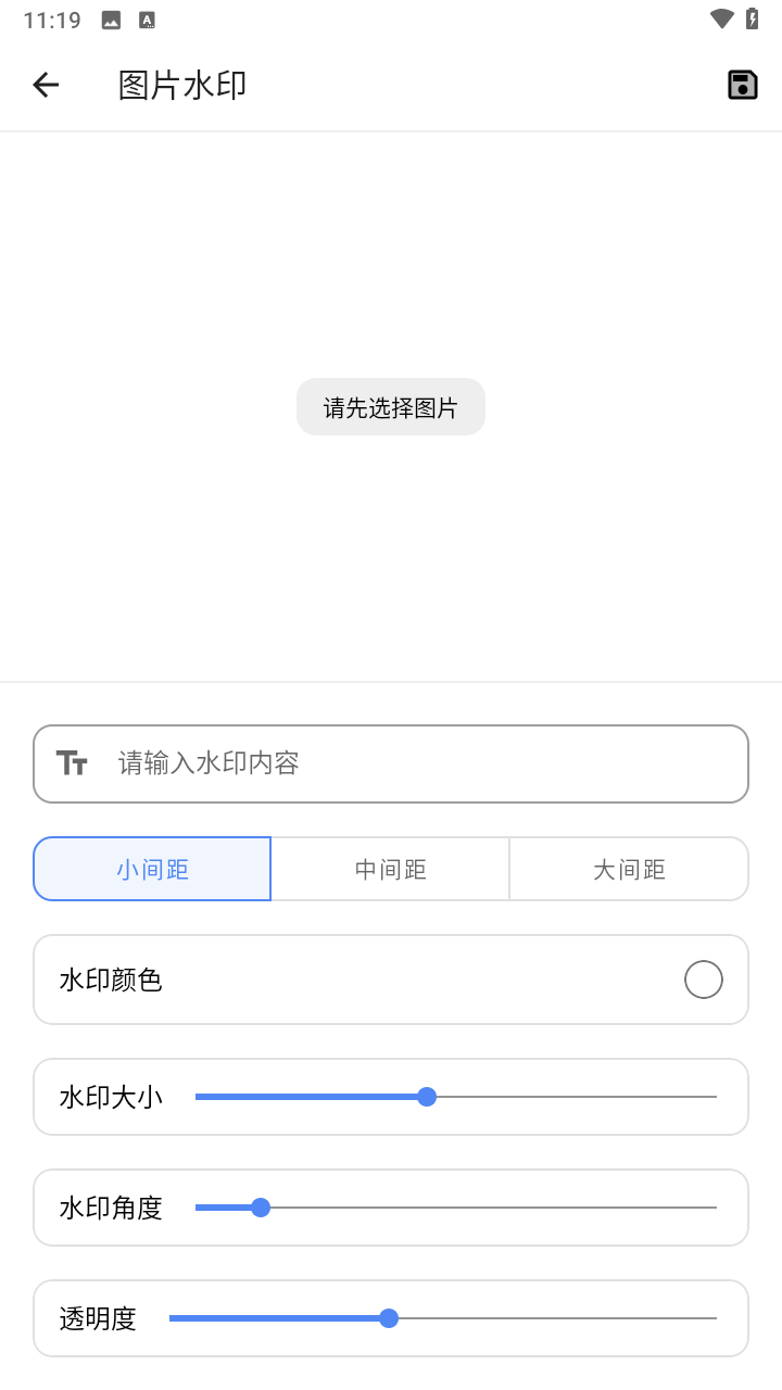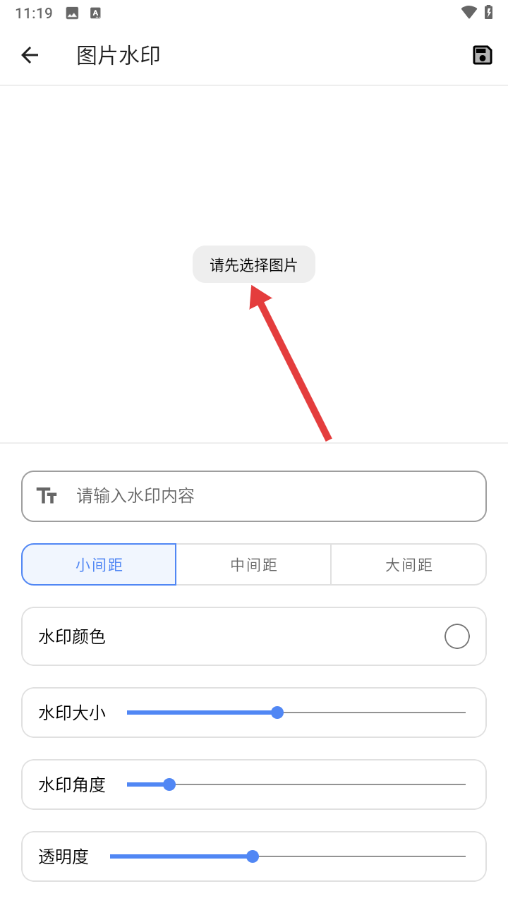 3、进入水印编辑页面后,点击请先选择图片”区域,从相册中选取目标图像。
