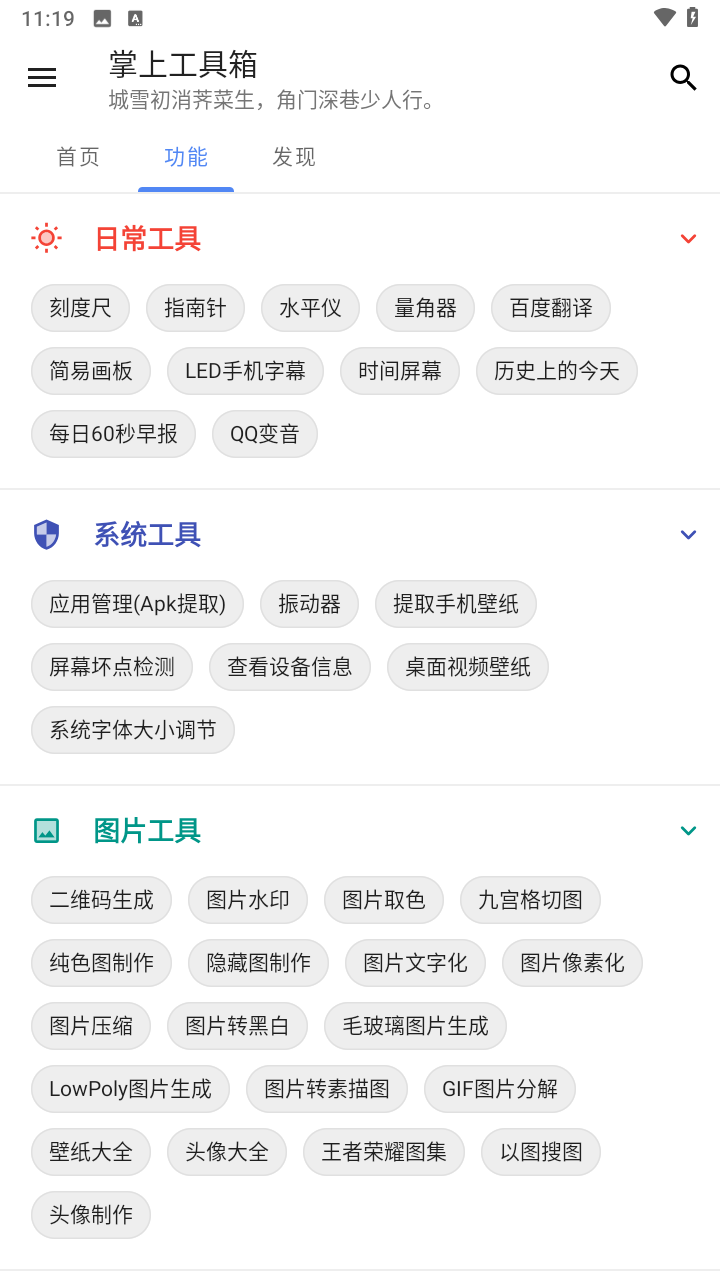 掌上工具箱,集成了日常实用、系统辅助、图像处理等多种功能模块,满足用户多样化需求。所有功能完全免费开放,无需任何充值或会员操作,轻松实现高效便捷的使用体验。通过关键词搜索,快速定位所需工具,省时省力,功能覆盖面广,真正实现一站式服务。