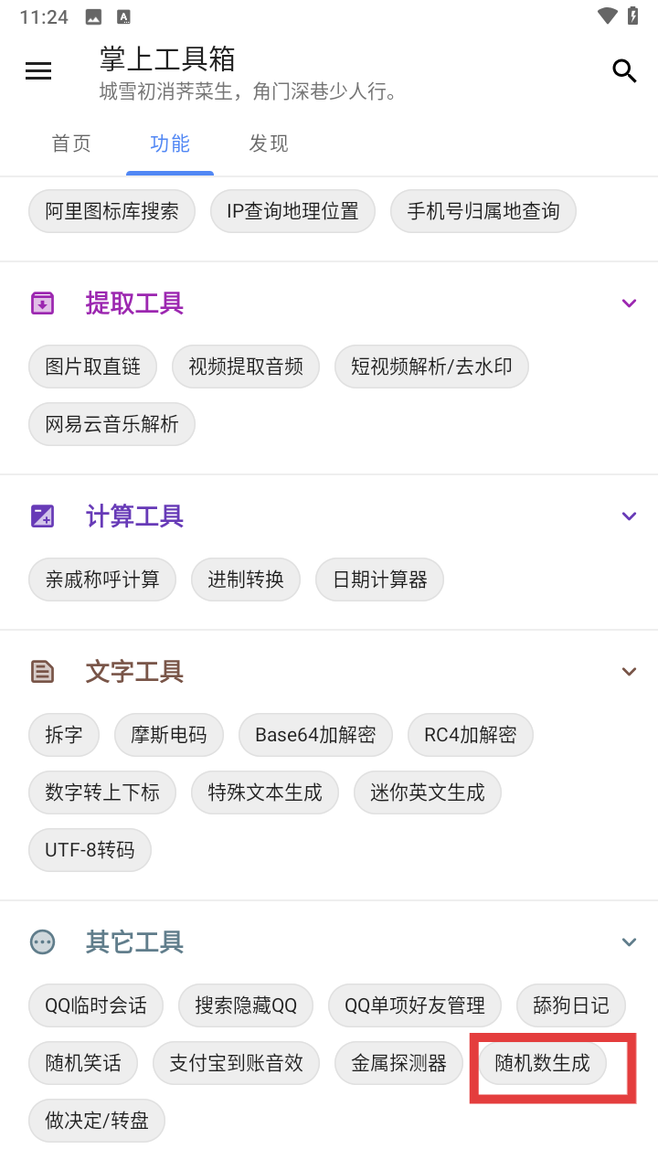 1、打开掌上工具箱应用,在主界面向下滑动屏幕,查找随机数生成”功能入口。