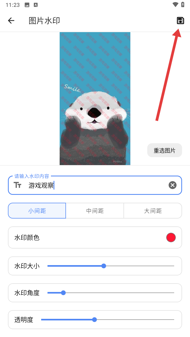 4、根据需要设置文字内容、字体颜色、字号大小、旋转角度及透明度等参数,调整完毕后点击右上角保存”按钮。