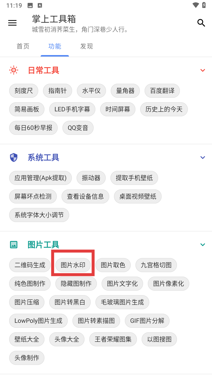 2、在首页功能列表中,找到并点击图片水印”选项,如图所示进行操作。