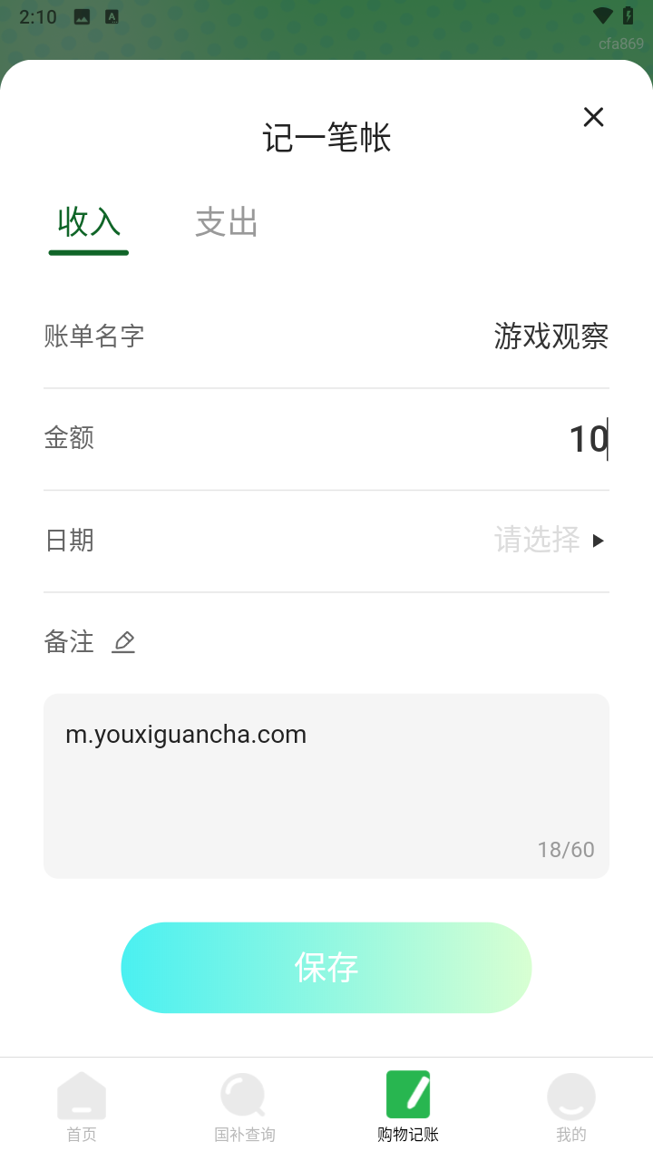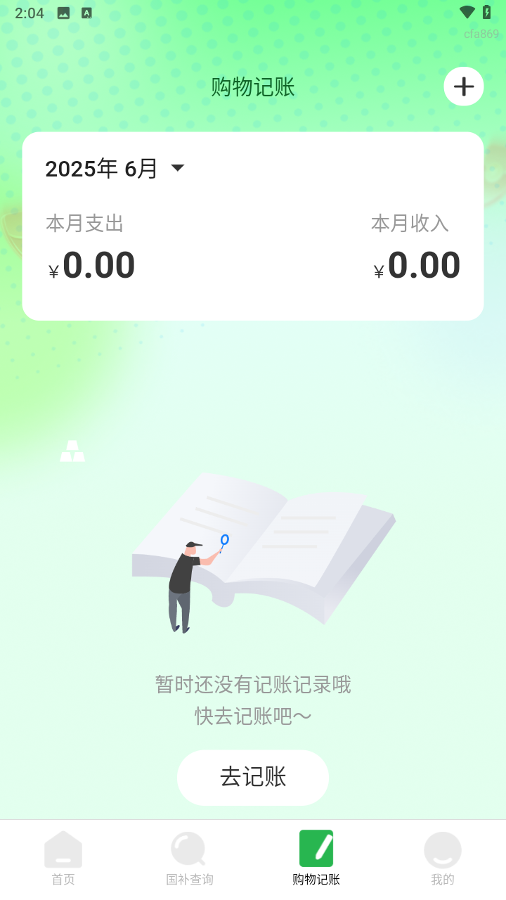 4、切换至底部菜单中的购物记账”功能,用户可随时记录本月消费与收入情况,支持自定义金额与分类查询。