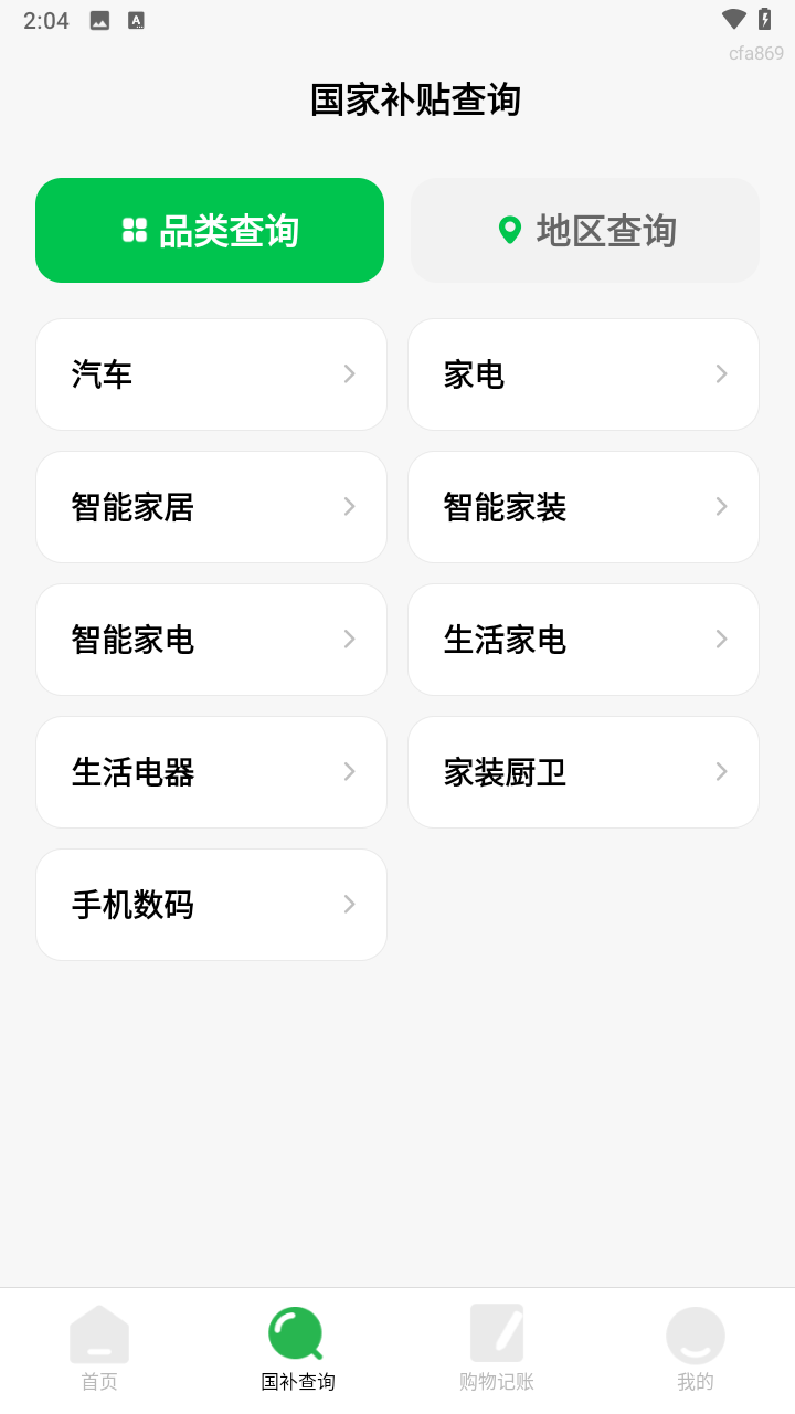 2、在底部导航栏中选择国补查询”功能模块,点击进入地区补贴详情页,如图所示。