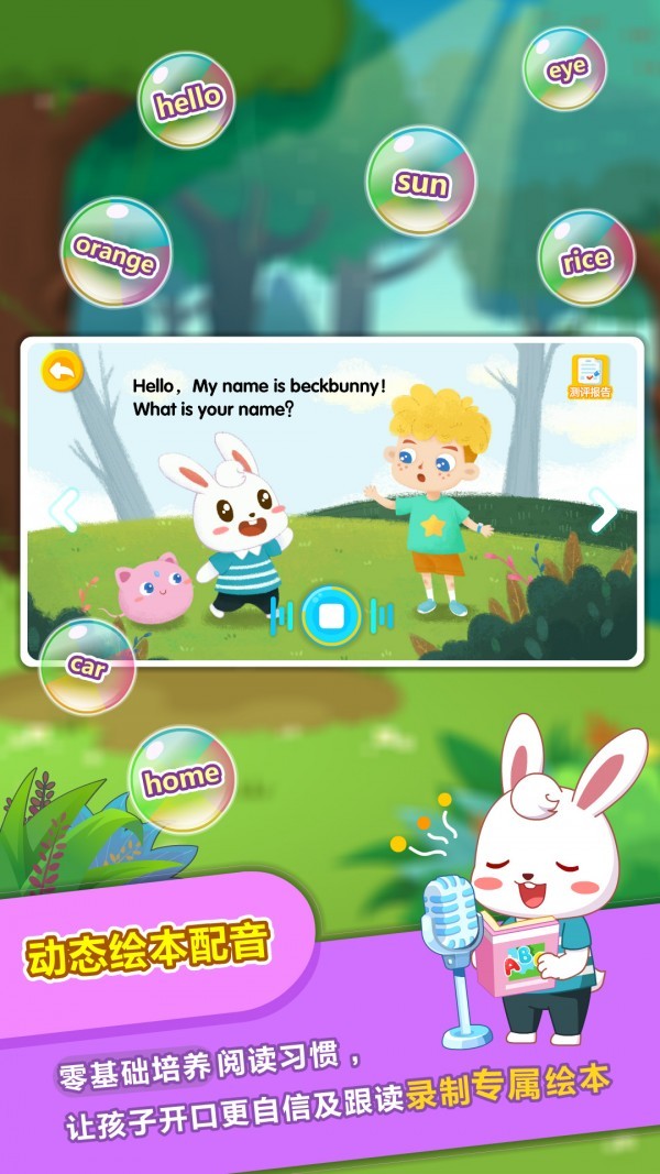 3、评测纠错:兔小贝儿童英语App针对儿童优化的语音系统跟读纠错,掌握听力和口语能力情况。