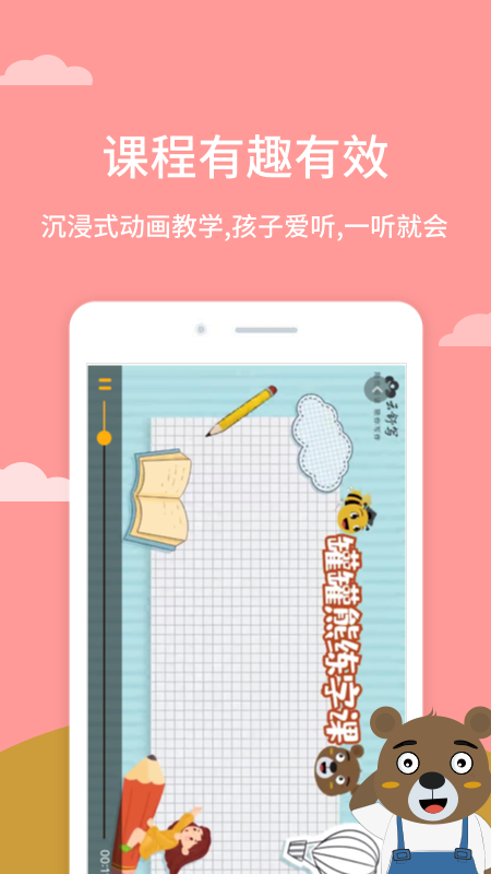 2、课程有趣有效:罐罐熊练字课程针对5-12岁儿童特点,全部采用动画课程,孩子爱听、一听就会!