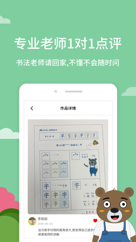 用罐罐熊练字app,老师会对孩子的作业进行一对一的点评,非常贴心,让孩子从小就练就一手好字!快来下载罐罐熊练字app吧!