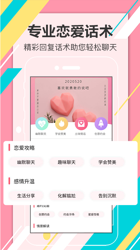 恋爱话术聊天库是一款教你在交友过程中,如何有技巧地聊天沟通讲情话,恋爱养成的app。