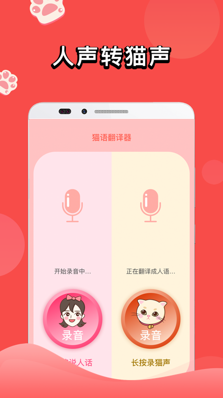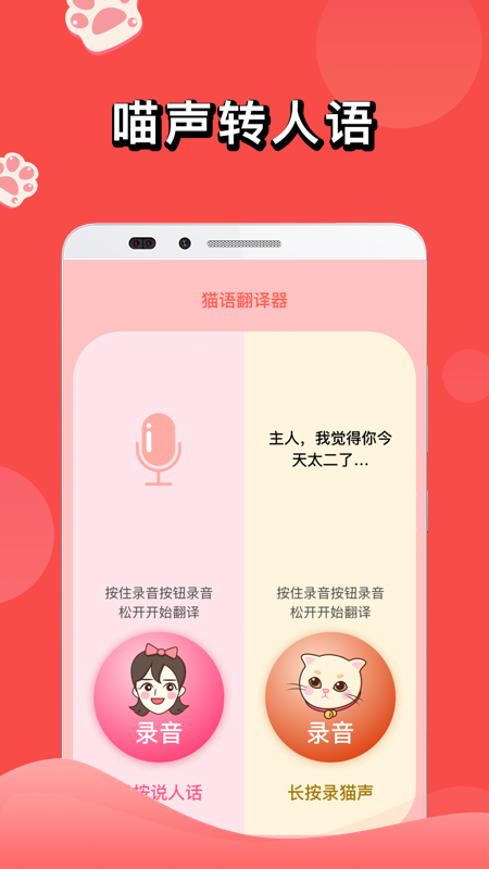 人猫交流器是一款猫语翻译软件,它可以将用户的声音转变成猫叫,让你的小猫咪听懂你说的话,人猫交流器安卓版(猫语翻译)也可以将猫叫转化成人类的语音,想和自己的小猫咪进一步交流,就快来下载人猫交流器app吧!