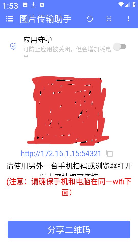 4、返回主页面后,选择分享二维码”选项,生成当前设备的连接凭证。