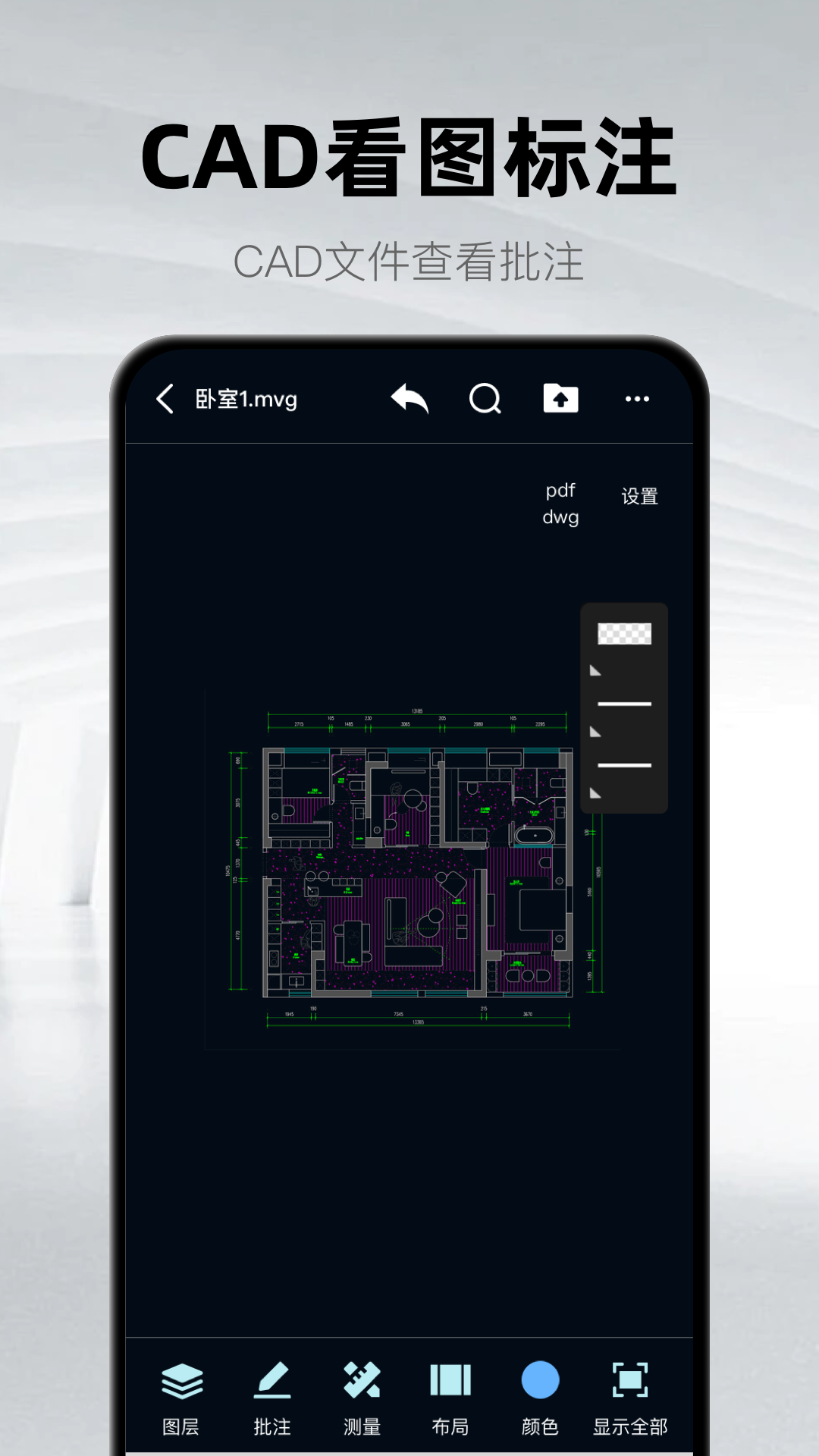 手机CAD看图纸,全面兼容各类CAD文件格式,流畅查看不卡顿,确保图纸内容完整呈现,杜绝乱码问题。支持DWG、DXF、DWF等多种主流设计文件直接打开,无需转换,随时随地高效查阅,满足工程、建筑、设计等多领域需求,内置多种实用测量工具,助力移动办公更便捷。