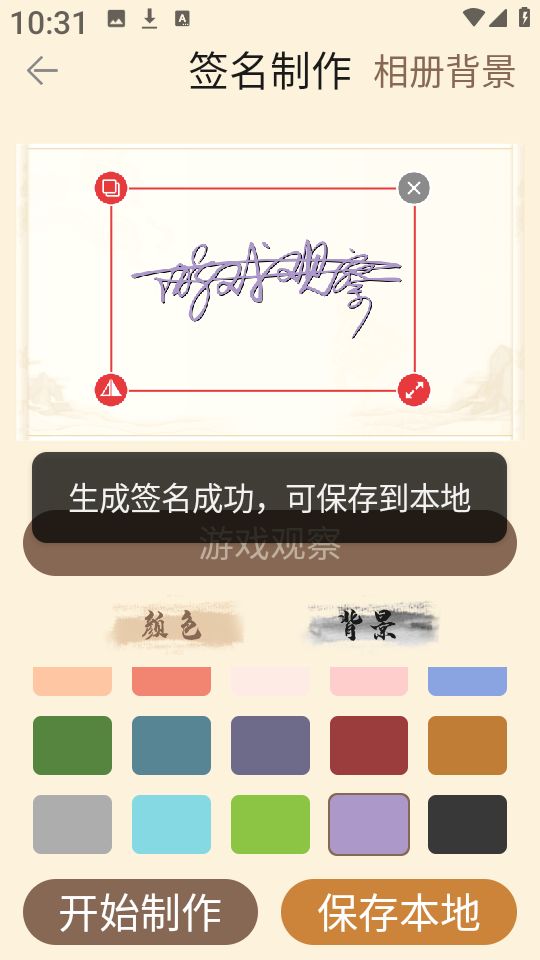 4、系统将自动生成精美签名效果图,显示生成成功”提示,用户可一键保存高清图片至手机相册。