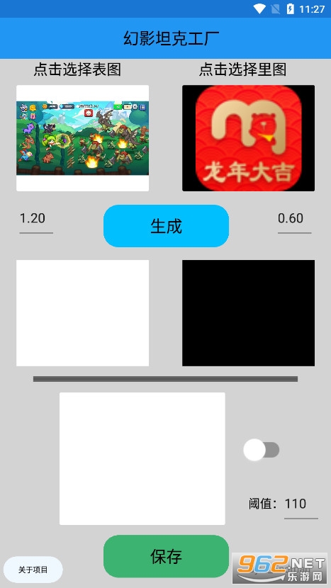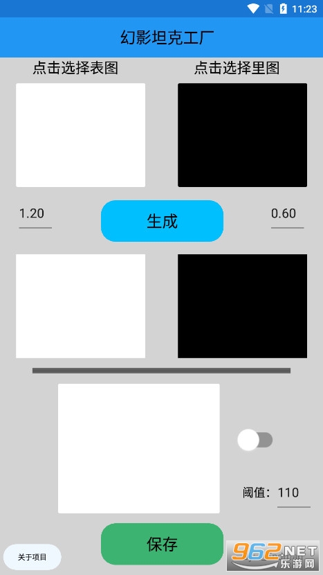 界面如图,我们所需要关心的只有第一行的两张图,调整参数,生成和保存按键。第一次进入这个界面默认是没有图片的,只需要根据第一行的箭头提示,从文件中选择图片作为表图和里图即可。