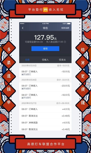 平台先行垫付车费,每周定时结算至支付宝账户,佣金秒到账,资金周转无忧
