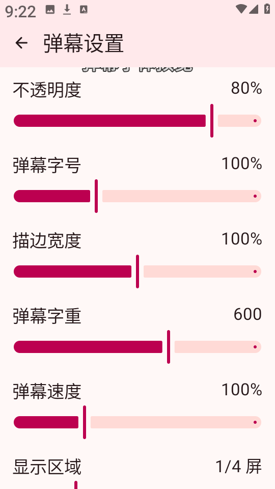 3、在此界面可自由调节弹幕字体大小、描边粗细、字重强度、滚动速度以及显示区域等参数,打造专属弹幕风格。