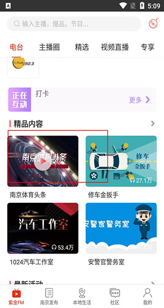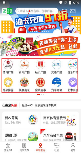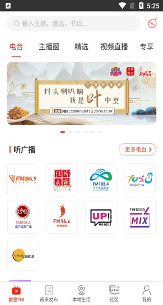 2、向左滑动屏幕进入紫金FM频道,实时收听本地广播节目;