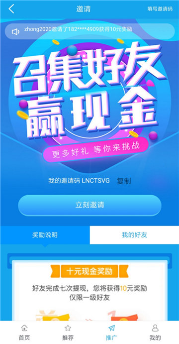 4、每邀请一位好友使用即可获得10元和两级好友12%的任务分成。