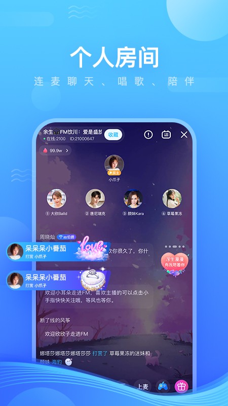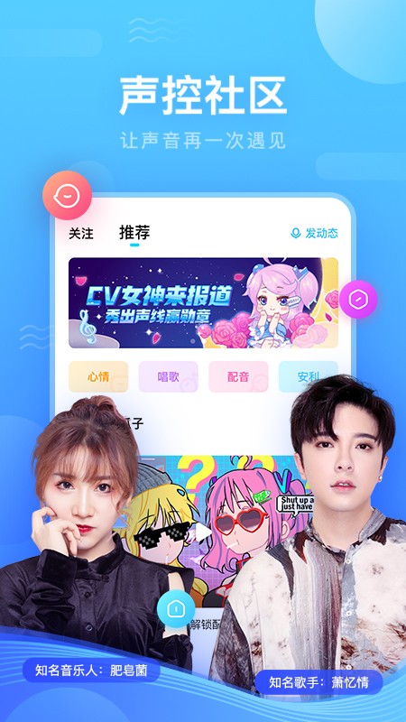 一款声音交友平台,用户可以这里进行直播,凭借你感兴趣的声音去交友,简直是升空的福利,在这能享受到极致的听觉盛宴,深受年轻人喜欢。在这里可以谈心,可以聊自己的兴趣爱好,可以聊最近在追的剧,来这找到和自己兴趣一样的人吧。