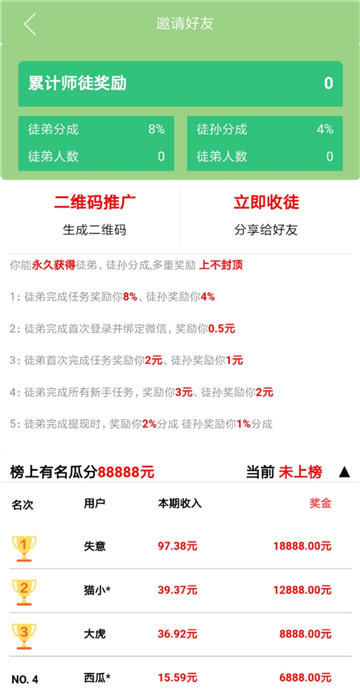 4.邀请好友可以享受好友共计12%的任务分成,一人做任务两人拿提成,邀请越多赚得越多。