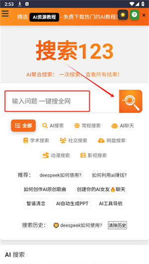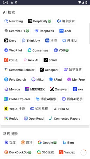3、然后选择想要使用的搜索引擎类型(如AI搜索、常规搜索等,若不选择则默认全部搜索)。