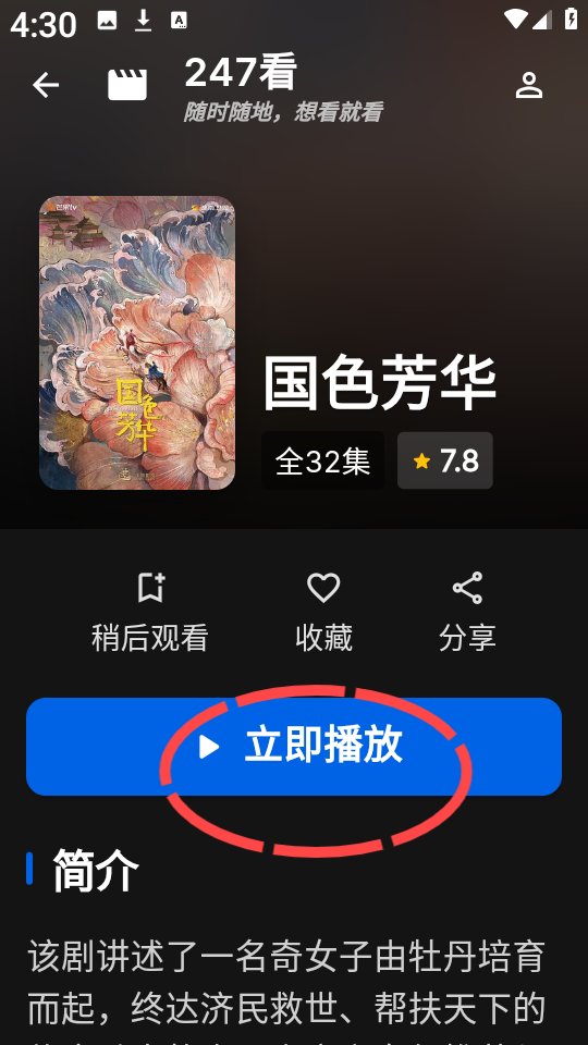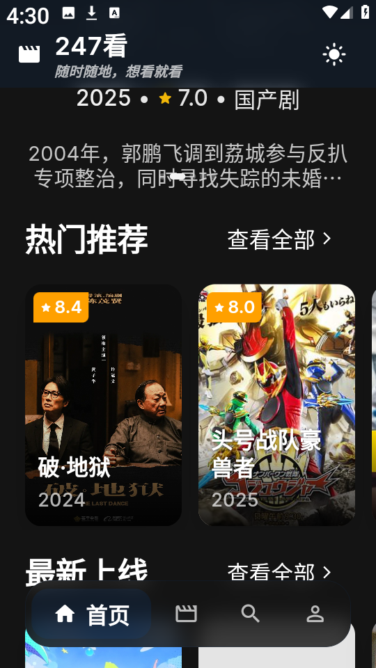 247看,内置多条播放线路,遇到播放卡顿的情况,可以自定义进行切换。有智能的搜索模式和分类筛选功能,通过输入剧名或者关键字,就可以快速找到喜欢的影视资源,无需任何付费操作,实时高清蓝光画质播放。