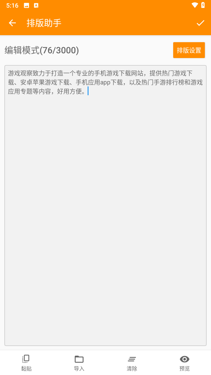 极简排版助手,支持自动优化文章段落,提取段落标题,开启文中自动配图功能。无需任何付费操作,所有的功能都是可以免费使用的。支持文章一键预览功能,支持一键清除功能,适用范围广泛。