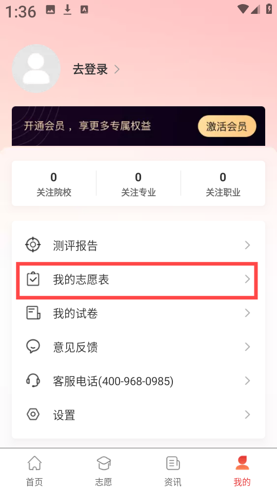 2、接着点击下方的志愿”,找到智能填报”即可开始模拟填写高考志愿。
