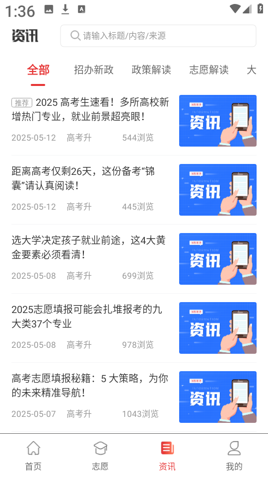 3、用户直接输入标题,内容,来源,可以快速筛选你感兴趣的高考招办政策。