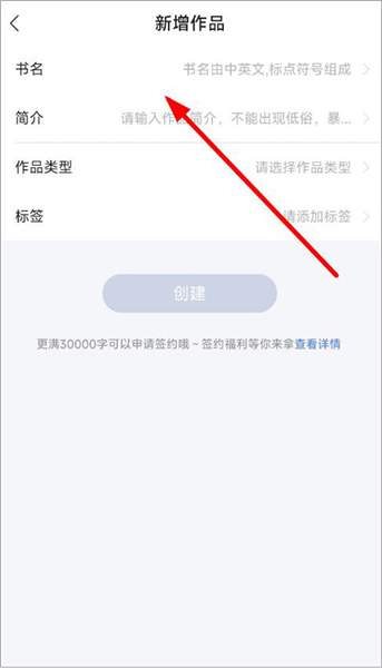 2、在作品页面输入书名、简介、作品类型、标签,点击创建。