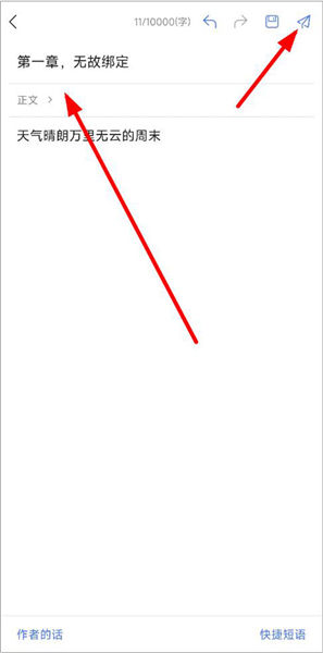 4、输入章节名称、正文,点击右上角纸飞机标志即可上传文章内容,待审核通过后即可发布作品。