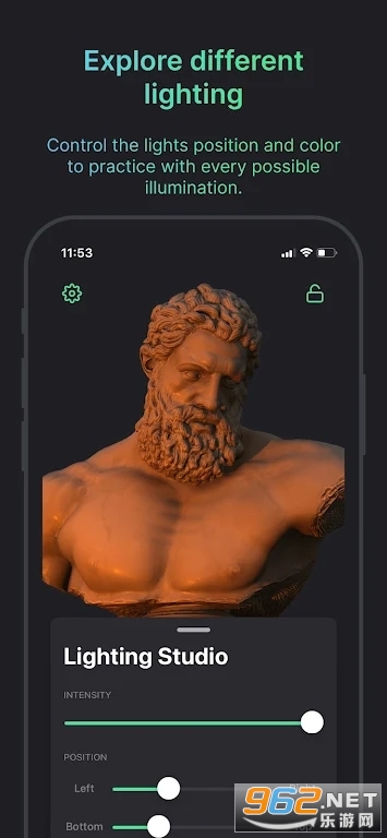 将光线更改为任何角度或强度。非常适合研究头部平面和了解肤色。