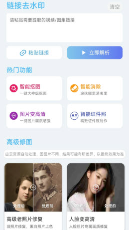 3.支持链接水印、智能抠图和消除,提高画质,也适用于老年老照片修复。