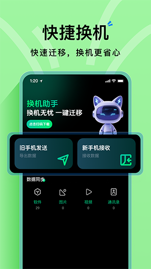 1、一键换机:简单操作即可完成新旧手机数据迁移。