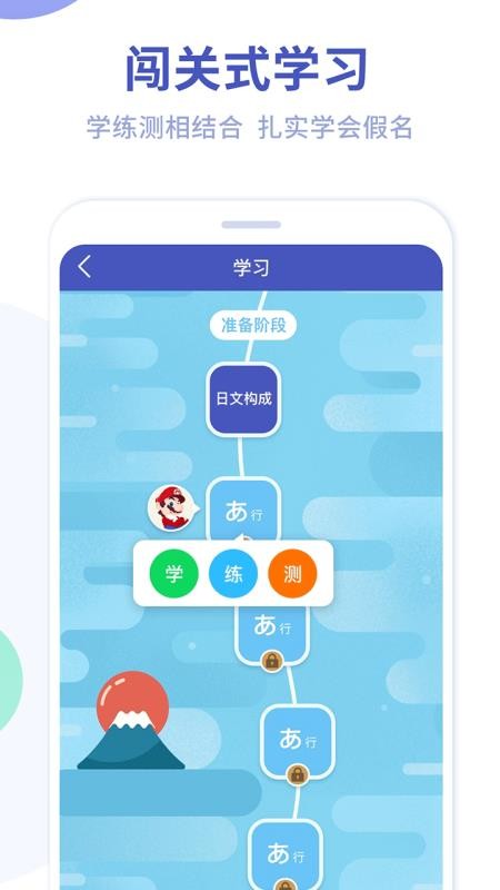 2、闯关式学习,趣味游戏练习,海量假名题库测试,全面巩固学习。