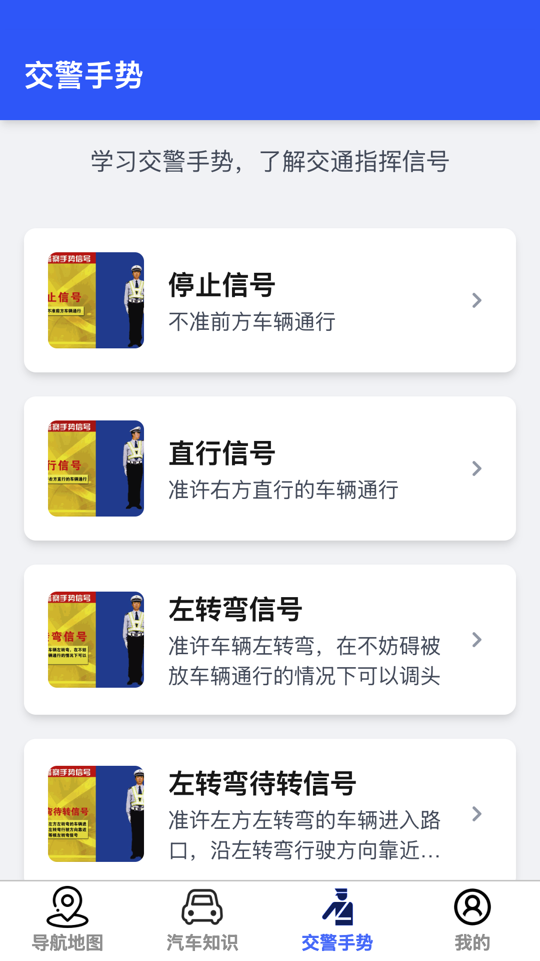 3.交警手势学习,让用户学习不同交警手势的含义,了解指挥的信号。