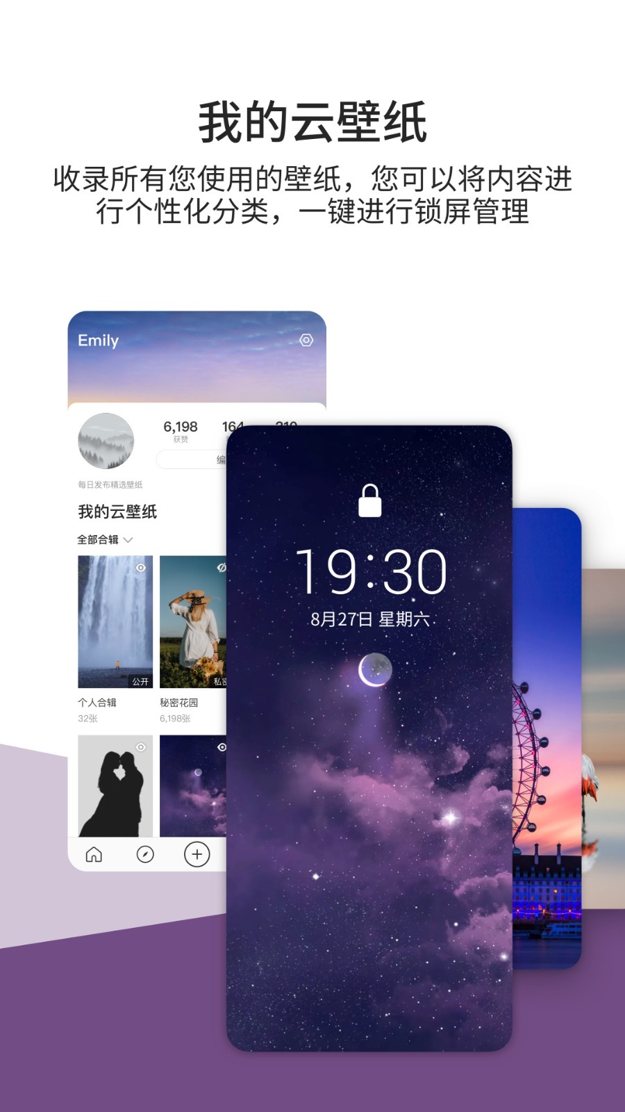 我的云壁纸,收录所有您使用的壁纸,您可以将内容进行个性化分类,同时一键即可进行锁屏管理
