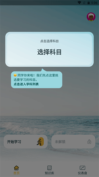 2、进入首页后,首页需要选择你要学习的科目,再点击开始学习”进行学习,会有专门的辅导老师进行教学。