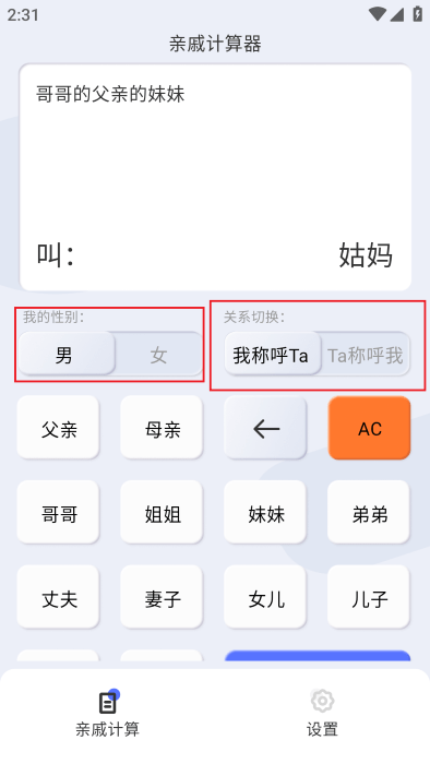 你可以选择性别,之间的关系也能进行切换,计算结果不一样。