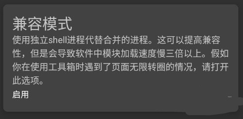 3.假如你在使用工具箱APP的过程中遇到页面无限转圈的情况,可以前往设置页面中,启用兼容模式。兼容模式使用独立shelli进程代替合并的进程。这可以提高兼容性,但是会导致软件中模块加载速度慢三倍以上。