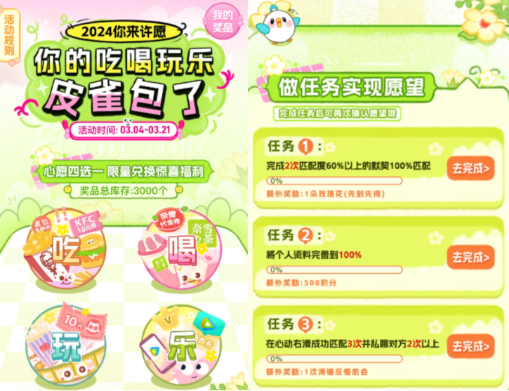 2026年,皮雀app基于用户需求的精准洞察,发现许多用户在找搭子”方面存在强烈的需求,为了满足用户这一社交需求,皮雀app推出了做任务是新心愿”的特色活动,用户参与活动找到新搭子”的同时,还能获得腾讯视频会员、肯德基、奈雪的茶、猫眼电影代金券等吃喝玩乐”大奖。