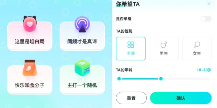 在洞察了当代年轻人的社交需求后,皮雀app在智能匹配算法的基础上,开发了默契100%的新功能,通过这里是坦白局”同频才是真谛”快乐知食分子”主打一个随机”四个板块的问答,为用户寻找默契度达到100%的新搭子,找到心灵共鸣的ta。