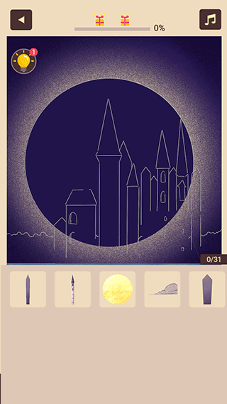 2、在这个你独有的艺术空间里,你可以根据艺术图稿提供给你的色彩贴片进行拼图操作;