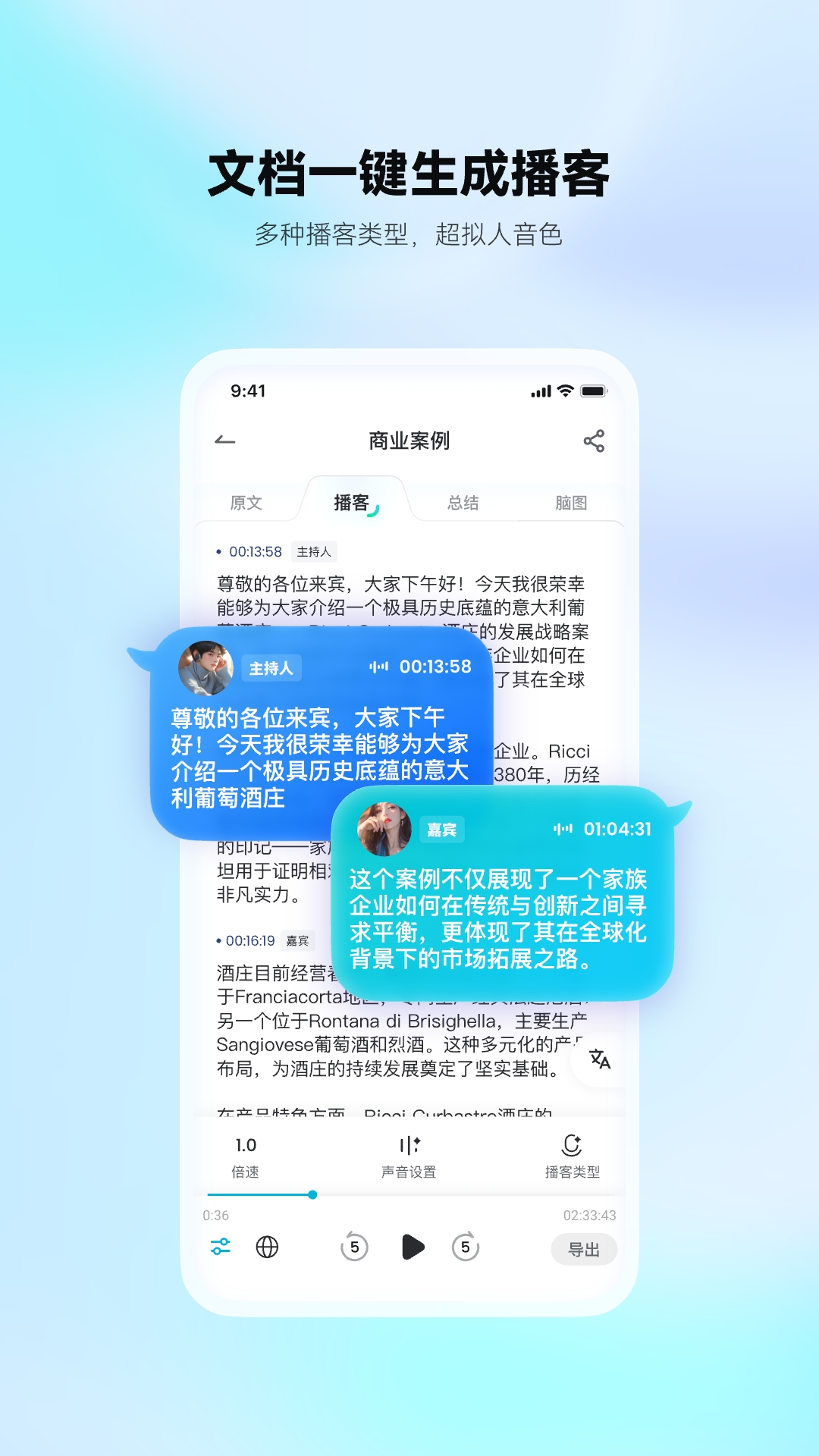有道文档FM是一款智能工具,软件拥有文本/文档转播客,实时录音转写,多语种同传翻译等等功能,并且软件适用于多种播客场景,拥有多种音色选择,觉得不错的朋友赶紧前来下载使用吧。