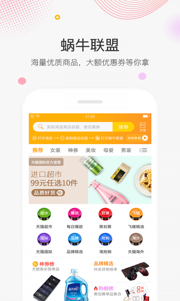 蜗牛联盟可以查看淘宝、天猫的商品优惠券并支持分享给朋友,超高购物返佣,百万大额优惠券每日海量更新,真正给用户省钱还能赚钱的APP。