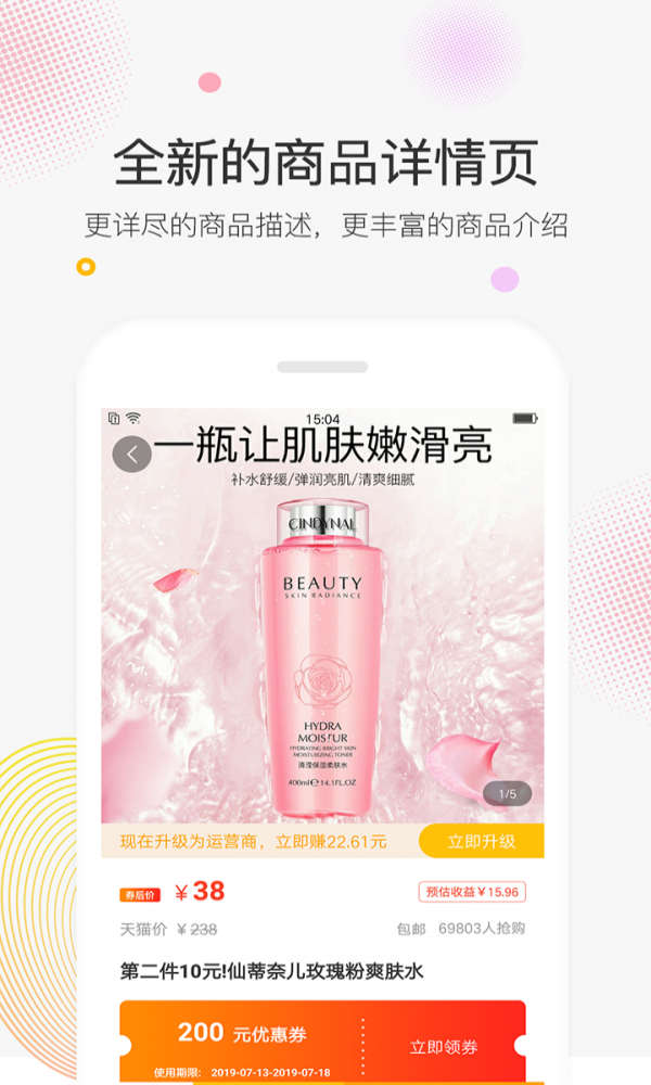 平台之后的所有商品价格都是比较低的,用户在购物的过程中能够通过分享模式来赚取收益,打造更加优质的商品资源内容,能让每一位用户轻易的去领取一些优惠券,每天都会给用户推送一些全新商品,这些商品资源能让用户按照自己的想法筛选获取,能够让更多用户得到更多的购物便利。